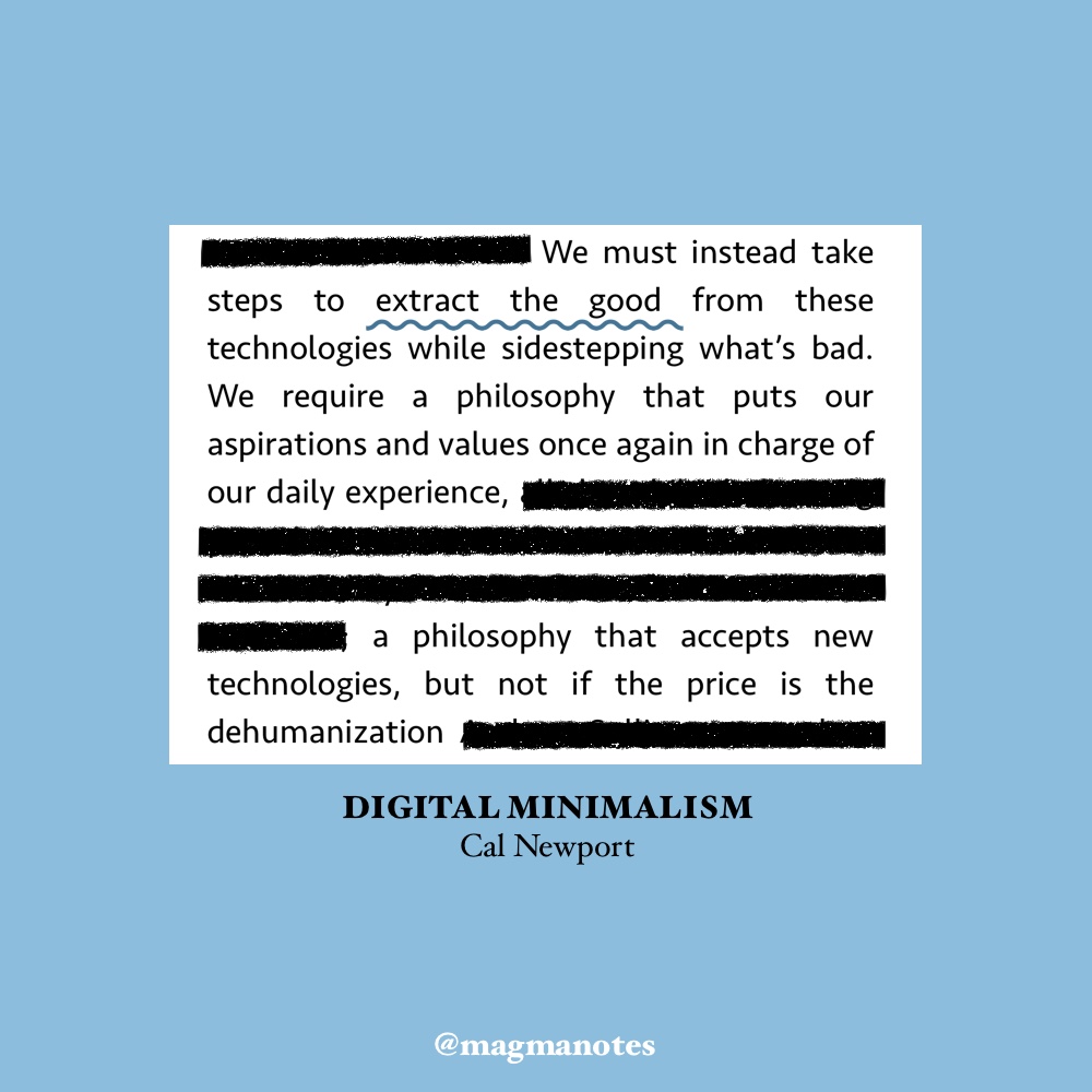 “During this period, you’ll wean yourself from the cycles of addiction that many digital tools can instill, and begin to rediscover the analog activities that provide you deeper satisfaction. You’ll take walks, talk to friends in person, engage your community, read books, and stare at the clouds.”