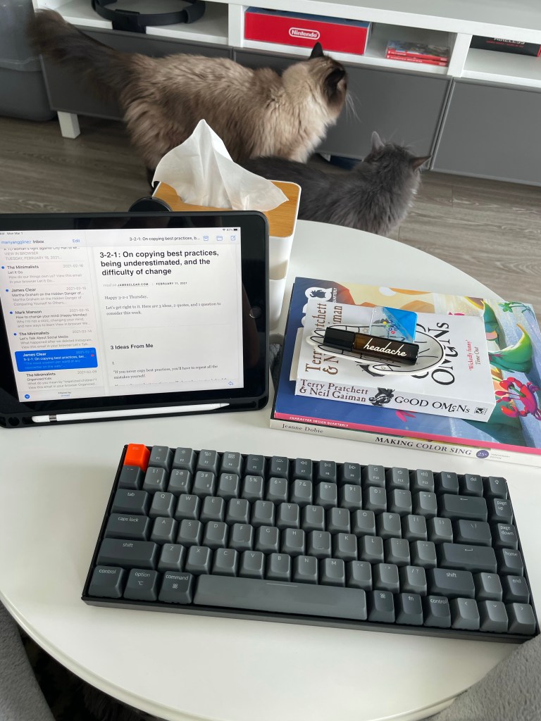 Anywayz, natutuwa akong mag-type. May bago kasi akong keyboard. Yung takatak keyboard. Nag-decide ako sa Keychron K2V2 after some grueling research. Thank you sa pambubudol ng Intelligent People Discord server. Pero tumupad pa rin naman ako sa pramis kong hindi ako bibili ng kahit anong gadget this year kasi na-reimburse yung pinambili ko nitong mechanical keyboard. So wala pa din akong ginastos. Pero sana mapigilan ko yung sarili ko na bumili nung bagong lalabas na iMac this spring (ayon sa rumors). Baka pag hindi ako nakatiis mangutang ako sa travel fund namin huhu.