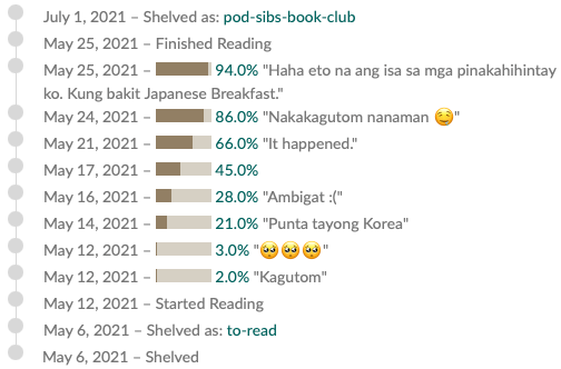 Merong required listening after basahin ‘tong book na ‘to. Yung In Heaven ng Japanese Breakfast. Yun pala yung hindi ko nabanggit. Lead vocalist sya ng isang band (sa mga nakabasa na for sure alam nyo na ‘to). Sinulat nya yung song na ‘to para sa nanay nya. Ang ganda nung sinabi nung isang book club member about sa song na ‘to (Hello Justin). Sabi nya, it’s the book in the form of a song. Super agree.