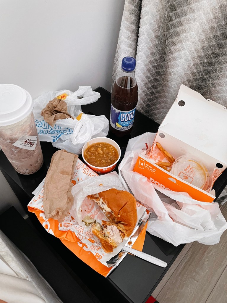 Bonjour à tous! It’s been a long time que je n’ai pas écrit en français ici. Je mange un sandwich au poulet et des frites from Popeyes (mon plat préféré). J’ai aussi commandé ma boisson préférée from Happy Lemon. Pendant manger, je regarde des cours de français sur YouTube.