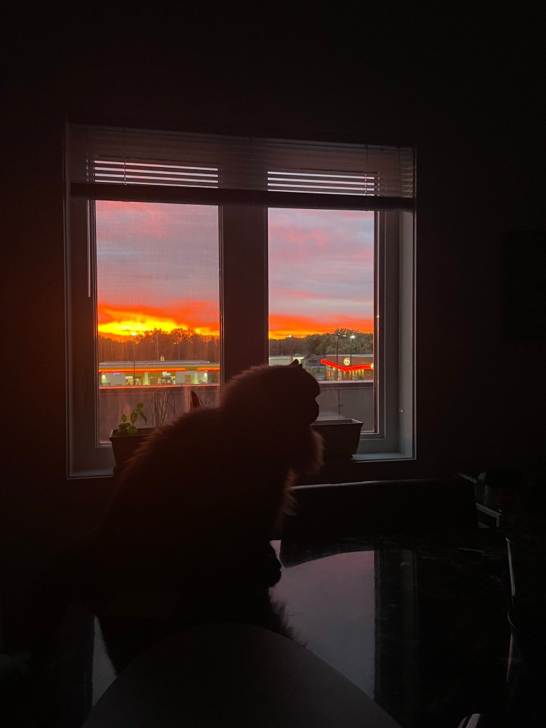 Nagiging orange na rin yung bandang taas. May lumipad na ibon. Sumampa si Cashew sa lamesa.