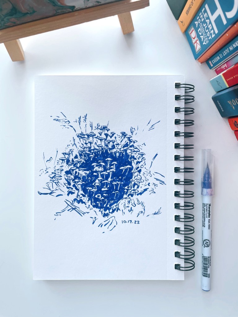 But when I looked at it that day (Oct 17), I was very receptive and calm. I thought it would be relaxing to draw each and every mushroom cap and its stem. I never think like that before. I usually like variety and randomness. Guess I still have hangover from the day before.
