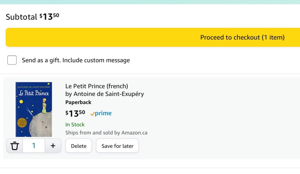 Nakwento ko kay Kenneth na ipi-print ko yung Le Petit Prince (The Little Prince) na book. Meron kasi akong online copy na hiniram ko sa Libby, tapos balak kong i-screenshot yung pages at i-print para ma-highlight at makapag take notes ako. Tapos sabi nya, ba’t di na lang daw ako bumili nung libro. Sabi ko, “Oo nga ano.” Dahil siguro nasa tipid mode ako, hindi sumagi sa isip ko na mas okay ngang bilhin na lang yung book. At dahil dyan..