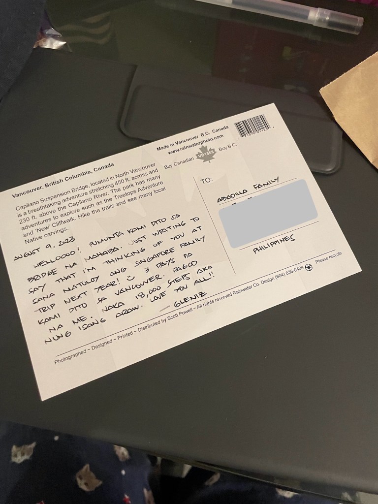 - Sent a postcard to my family in the Philippines while we were in BC. They received it after 2 months 😄