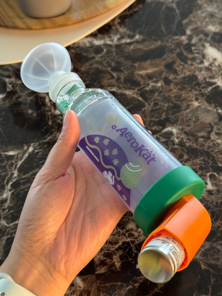 It’s time for Almond’s inhaler. She has been diagnosed with asthma a week ago huhuhu. Imbis na ma-sad, iniisip ko na lang na at least she’s getting treatment now. Medyo tricky yung pag-administer nung inhaler kasi kelangan nakasuot ng maayos yung mask, tapos 10 breaths para makumpleto yung isang dose.