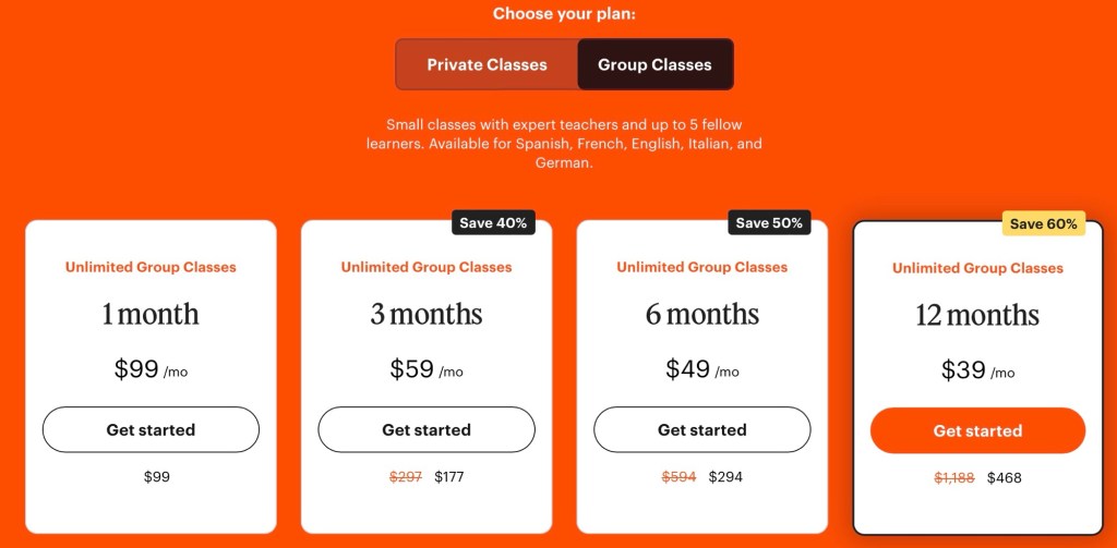 It depends on the monthly subscription plan you choose. The longer the plan is, the cheaper it costs. There’s also an option for private or group classes—with private classes being more expensive. What I love about Babbel Live is I can take unlimited classes during the period I’m subscribed. *unliiiimiteeed 🎶* (sorry I just watched Wicked, iykyk 😂) I chose the 6-month group classes subscription on a 50% discount during their Black Friday Sale.