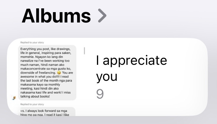 As someone na ang favorite love language to receive ay words of affirmation, pakiramdam ko hindi ako ganun ka-satisfied kasi hindi natural kay Kenneth ang pagiging expressive. Napagusapan na naman namin ‘to, pero talagang may mga bagay na hindi kayang pilitin. Okay lang. Na-accept ko na. Kaya naman pag nakaka-receive ako ng compliments from other people, SOBRANG nakakataba ng puso. And because words of affirmation rarely come my way, sinunod ko yung napanood kong idea na gumawa ng album sa phone, with screenshots of messages from people expressing their appreciation and sending uplifting statements.