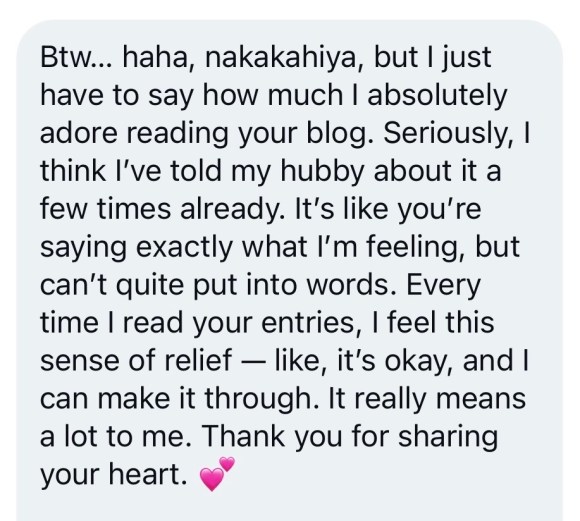 I shared this with Kenneth and tried reading the message out loud to him but failed ‘cos I started crying. Thank you for your generous words 🥺