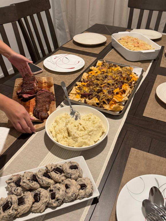 Just as I was taking the first batch of cookies out of the oven, I heard, “We’re home!” and saw Aryan walking through the door. Surprised by their sudden presence, we still shouted, “Surprise!!” Ideally, the plan was for them to walk into a fully laid-out dinner table, but instead, they caught us mid-chaos, in the middle of cooking. Nevertheless, they appreciated the thought behind it, and after a couple more minutes, we finally sat down to eat. Everything was delicious!