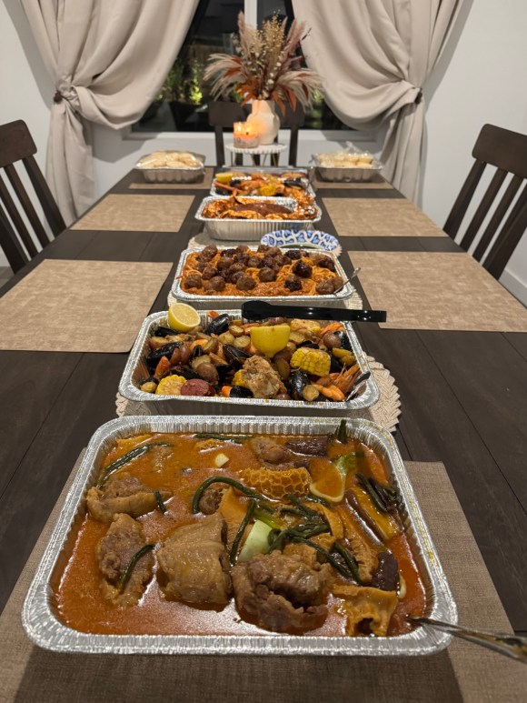 On our last night in Bakersfield, we once again decided to cook dinner. And just like last time, everything was délicieuse. Hudas cooked kare-kare and meatball spaghetti, Benson (for fear of washing the dishes again) made seafood boil, I baked some revel bars, merong puto, and Kriscelle and Asi brought Christmas ham. It was a beautiful spread. Then naturally, drinks and singing later ensued.