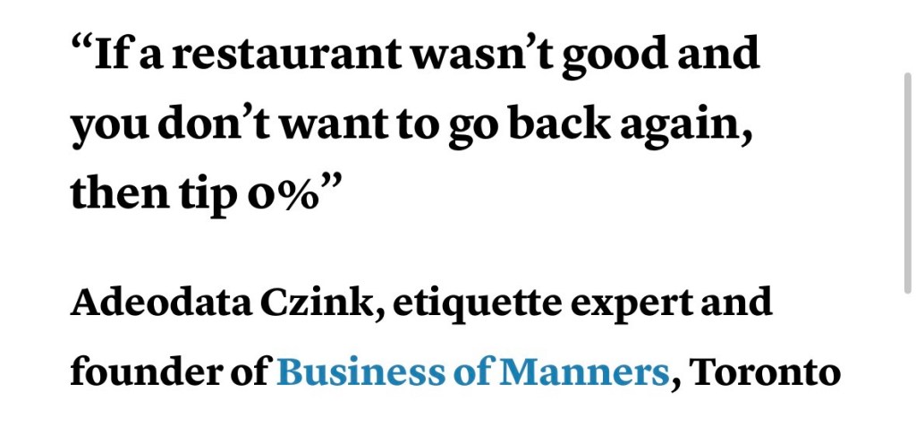 Basta ako naniniwala ako na it shouldn’t be up to the customers para magkaron ng living wage ang mga servers. Responsibility dapat ng employer na bigyan sila ng maayos na sahod at wag umasa sa mga tips ng customers.