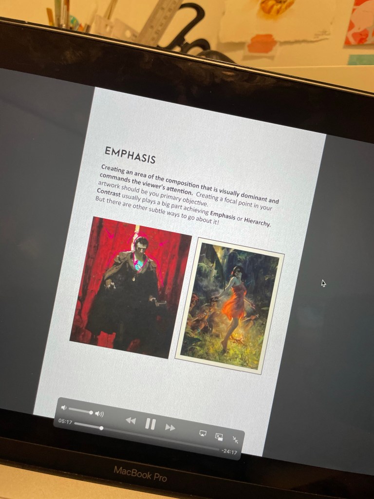 Nakakaaliw panoorin yung class. Kasi dalwa sila. Yung artist, si Ross, plus si Stella, the “student voice”. So ang ganda na merong student voice kasi sya yung nagtatanong habang nagpe-paint si Ross. Mga questions like, “How did you make this shadow?” or “What are you thinking while doing the sketch?” At ang galing nyang student voice kasi ang thorough nya. Lahat talaga tinatanong nya. Tapos may mga moments na nagkukulitan sila so natatawa ako. Parang hindi lang sya rigid na video tutorial, medyo pang podcast din kasi may mga chika moments.